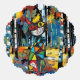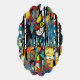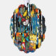 A whimsical cat with a geometric, stained-glass appearance stands in a vibrant forest of birch trees. The background features a colorful blend of autumn leaves and hues of blue and yellow. Digital Art Photoshop