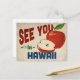 A charming Hawaii vintage travel postcard featuring a lovely red apple, along with fun retro style text that says, "See you in Hawaii"