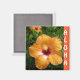 Hawaii magnet features a pretty tropical flower - an orange and coral colored hibiscus in warm Hawaiian morning sunshine with the traditional greeting of aloha.