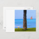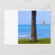 Picture of a Waikiki, Hawaii shore scene of a bird (in most pics) walking to the left, a trunk of a palm tree upright on grassy shore. A sailboat with red and yellow striped sails sailing in the blue Pacific ocean waves off Waikiki, Hawaii. Some white clouds in the tropical background. Digital photo.