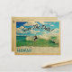 Vintage Hawaii Save The Date postcards featuring a surfer riding a wave in an aqua turquoise ocean, with puffy blue clouds above. This cool mid-century retro design is the perfect way to gather guests to your Hawaii destination wedding.