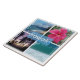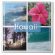 Stunning photo collage Hawaii featuring a sandy beach, palm trees, a lavender sunset over the horizon, and an aqua blue ocean.