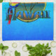 Hawaii beach sunset painting with palm trees, round bamboo frame, and a colorful parrot.