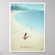 Vintage style travel poster of a woman on a Hawaiian beach, inspired by the travel posters of the 1920s. Text reads Visit Hawaii. Original hand drawn and digitally rendered illustration by Henry Rivers for Travel Poster Co.