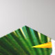 brilliant color, photo of green lizard on bird of paradise and anthurium flowers with bright croton and folded palm leaves in the background