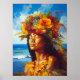 Celebrate the radiant beauty of island life with this vibrant tropical wall art featuring a serene Hawaiian woman adorned with a crown of flowers and fruit. Bathed in golden sunlight and set against a dazzling ocean backdrop, this art piece captures strength, peace, and feminine grace. Perfect for tropical-themed decor, beach house walls, or as a statement piece for lovers of culture and color. A bold and empowering gift for anyone drawn to island energy and artistic vibrancy.