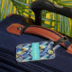 Custom luggage tag shown with a very tropical Hawaiian print with text.