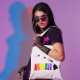 The name of the state of Hawaii in colors of the rainbow, along with the shape of the islands.