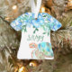 Commemorate your tropical wedding with this elegant floral hibiscus Christmas ornament. Blue hibiscus flowers and green banana leaves border your wedding photo in a beautiful tropical wreath. Add the year for a finishing touch. Blue and green sea turtle can be resized. Cute blue Hawaiian shirt with hibiscus flowers and sea turtle is a unique Christmas ornament.