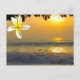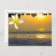 Send greetings from Hawaii with this picture postcard of surfers enjoying the waves at sunset. The setting sun casts a golden reflection across the Pacific Ocean. The greeting across the yellow and white plumeria says Aloha from Hawai`i