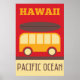 A fun retro design of a small bus with a surfboard on top against a red background. The text Hawaii at the top and Pacific Ocean at the bottom.