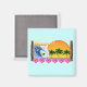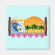Colorful Hawaiian surfing graphic, sunset with hibiscus flowers, tiki statues, and palm trees.