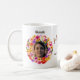 This chic mug featuring two colorful Hawaiian wreaths richly decorated with tropical flowers can be personalized with your any photos and text you like for a truly unique occasion like a wedding or an anniversary. Create a one-of-a-kind souvenir today by replacing both portraits inside each wreath and by changing the names above each photo and editable the texts.