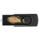 This simple yet elegant fine art photography USB Flash Drive features a Sharp Shinned Hawk perched on the top of a bird feeder hoping to catch a meal. He has a hunter's stare. His yellow talons and orange eyes are prominent. He has lovely rust and cream bands on his breast, white and black striped tail feathers, and a gray back. This hawk's prey is mostly small birds. Although the "Sharpie" is the smallest hawk in North America, he is a very fierce predator.