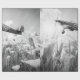 Hawker Hurricane WW2 black and white fighter plane side view low flying over poppies with canopy open