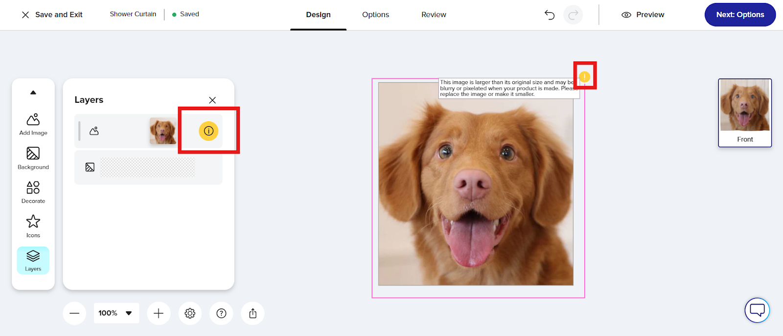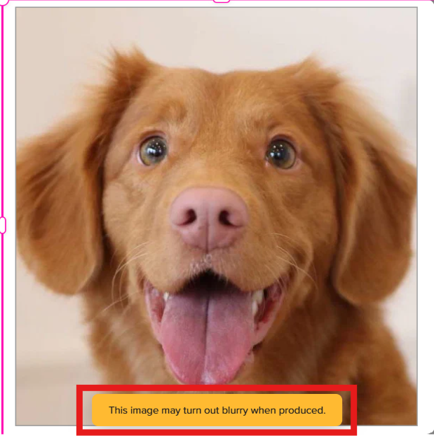 To fill the full area on any product, we recommend that you use images that are equal to or larger than the recommended sizes. In the Design Tool, a resolution warning will appear for any images sized larger than the resolution of the image allows.