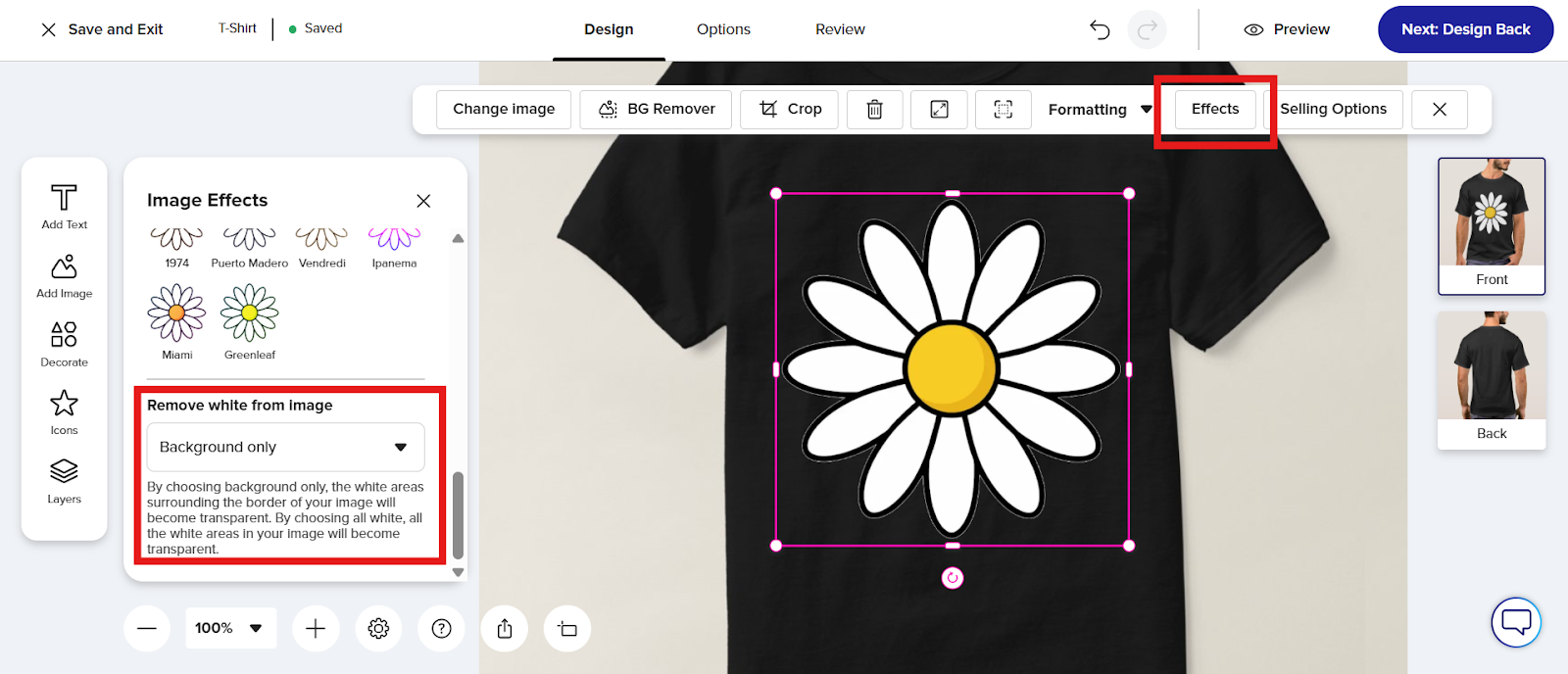 When designing for dark apparel, you now have the ability to specify which parts of your image should be transparent, and which parts should actually be printed as 'white'. After you've added an image to your design, click on the 'Effects' button in the design tool and use the “Remove white from image” option (see illustration above).