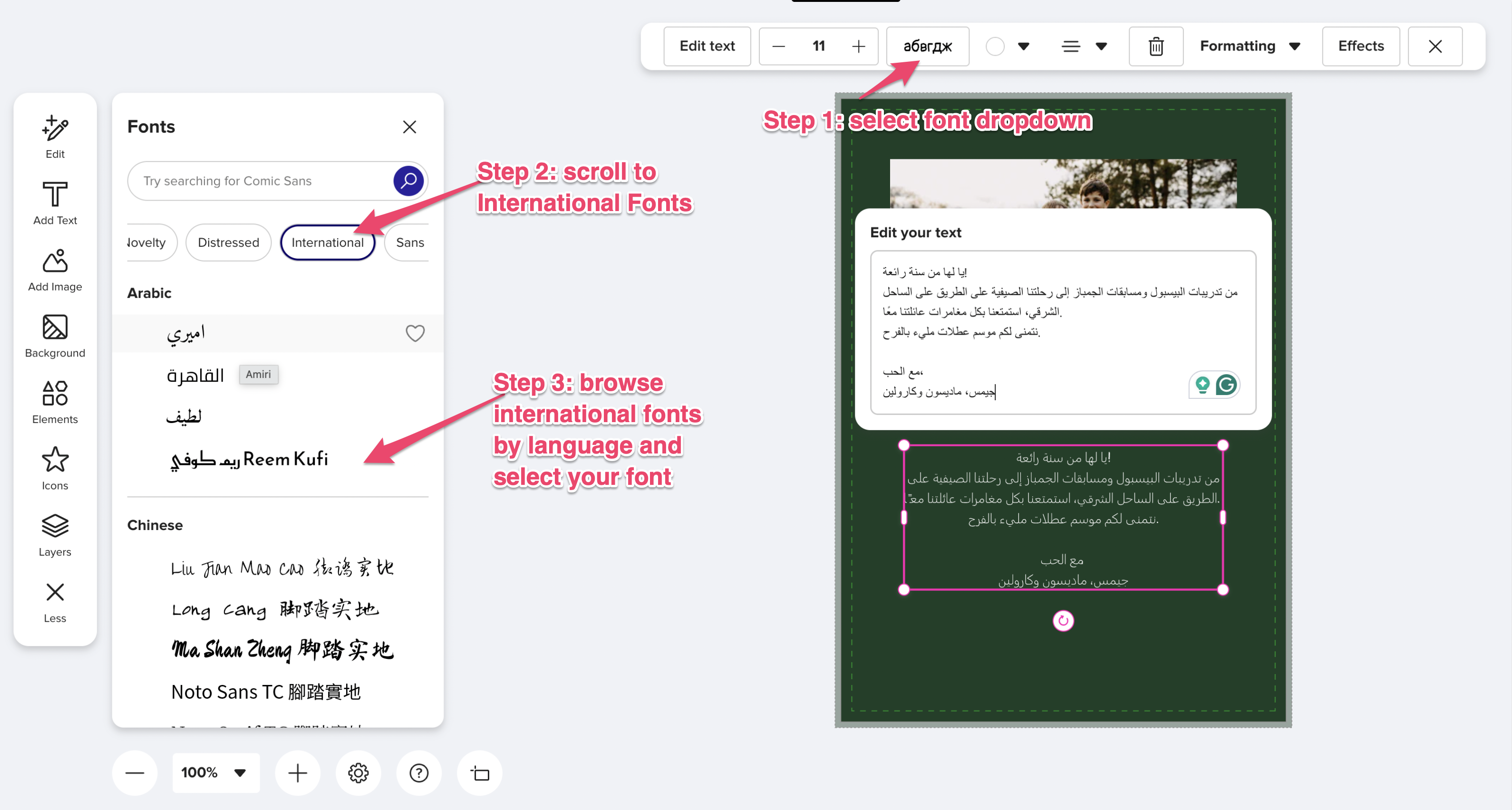 We also have fonts made for other alphabet types such as Arabic, Chinese, and even Hebrew! These fonts can be found in the “International” section of fonts in the design tool!
