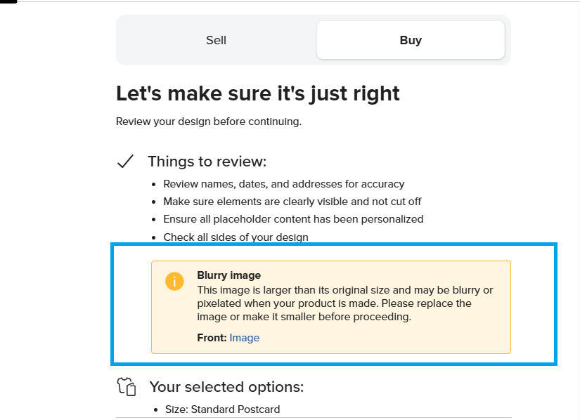 You’ll want to avoid low-resolution images, as they can result in poor print quality, appearing blurry or pixelated. Before you add the item to your cart, you will receive a message indicating that the image is blurry, prompting you to resize or replace the image.