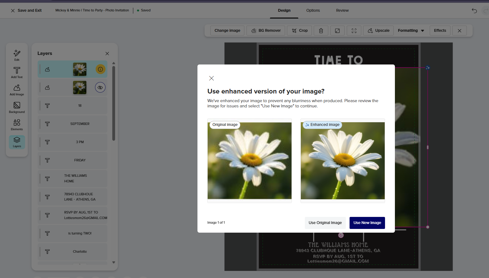 Some blurry images can also be upscaled in our Design Tool. Click ‘Preview Image’ to revert to the original image or to use the enhanced image.