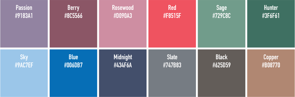 We’ve collected a set of swatches which may be useful in matching your letterpress and digital color elements. It’s important to mention that the actual letterpress ink may not match these exactly, but these should be very close.