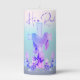This is a pillar candle with gradient pink to aqua to muted purple background. It has "He is Risen!" across the top of the artwork. The art is an Easter cross draped with cloth, and flowers surrounding it. May be personalized and fonts and images can be changed as well.