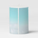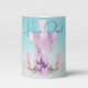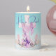 This is a pillar candle with gradient 'above the clouds' Heaven background in pastel green and blue hues. It has "He is Risen!" across the top of the artwork. The art is an Easter cross draped with cloth, and flowers surrounding it. May be personalized and fonts and images can be changed as well.