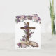 This Easter card features a graphic of a cross adorned with purple flowers with an open Bible laying at the base. There is a scripture verse on the inside left. There are pink and purple rosed along the top. The inside has a greeting reads "He is Risen" "Happy Resurrection Day. You can personalize with your names.