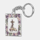 This Easter themed key chain has a pink and purple spring flower wreath borders along the edge on a bright white background. In the center is a cross with a Bible and a spring floral bouquet. The same design is on the back side.