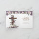 This Easter card features a graphic of Jesus holding a lamb near an open Bible and a crown of thorns. There is a scripture verse on the right. There are pink and purple rosed along the top and bottom. The inside has a cross with a lamb sitting at the base. The greeting reads "He is Risen" "Happy Resurrection Day. You can personalize with your names.