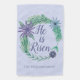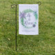 He is Risen. A beautiful religious scripture Easter garden flag with a beautiful floral wreath of purple and green on a pastel background. Pretty Christian church or family sign with your personalized script.