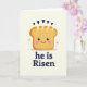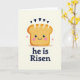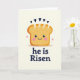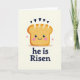 This card shows a cute, human-like slice of golden baked bread centered on a creamy off-white background, with big dark round eyes, rosy cheeks, and a small curved smile that feels like a friendly wink. The toast’s warm browns and tiny speckles give it a cozy, fresh-from-the-oven look, while its soft edges keep the character gentle and approachable. Above it, a neat row of small dark triangles points upward, like little celebratory markers lifting the scene. A few tiny four-point spark shapes sit nearby, adding a light twinkle that suggests a shared moment of joy 🌷. Below the character, the phrase “he is Risen” appears in dark indigo lettering, placed low and centered so it reads clearly at a glance. The contrast between the cool indigo text and the warm toast colors creates a sweet, affectionate balance, as if the character is proudly presenting the message to someone it cares about 🐰. The background stays uncluttered, with the upward triangles and small spark shapes framing the toast from above. The toast stands upright in the middle, with the indigo words directly underneath and the dark triangles hovering overhead.