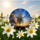 Has a old willow tree in a field with blue sky and white clouds and text that says