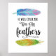 Typography Design with calligraphy and glyphs with words in black, "He will cover you with his feathers." Design is centered between two watercolor feather illustrations (blue and green) on top and bottom center of design. Scripture is from Psalm 91:4.