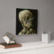 Head of a Skeleton with Burning Cigarette by Vincent Van Gogh, oil on canvas 1886, is a painted oil study of a human skull and upper skeleton, in the mouth of which the artist inserted a burning cigarette, producing an effect that is both macabre and humorous. Probably painted while Van Gogh enrolled in the Academy of Fine Arts in Antwerp early that year, the oil sketch is rendered in dramatically lit chiaroscuro, with bold areas of light painted in strokes of thick, impasto paint against a dark, earth toned umber background. This work was among the last that Van Gogh painted in his Dutch period style of somber earth colors derived from Rembrandt and 19th century Realist painters.