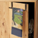 This kitchen towel has the illustration by Kristie Hubler, showing a scared Ichabod stopped by the Headless Horseman only to be asked to exchange a pumpkin for pie. Covered bridge is in the background, with big, midnight harvest moon in the sky.