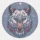Multicolored heads of wolves with boho decoration and sacred symbols on a gray background. Seamless pattern with contour tribal drawing of predators. Vector texture with animals. Native wallpaper