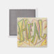 The word "Heal" is pale lime green and yellow in color. Behind the word is soft pastel pink and yellow hearts. Inspirational artwork by Laurel Latto for DonnaBellas Angels.