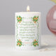 This religious candle has the bible verse Isaiah 58:8 - Then your light shall break forth like the morning, your healing shall spring forth speedily, and your righteousness shall go before you; the glory of the Lord shall be your rear guard. - within an elegant floral frame of orange flowers and green leaves against a white background.