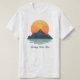 This beautiful T-shirt features a modern minimalist vector illustration designed to inspire peace and patience. The tranquil scene includes stylized dark blue mountains and a calming body of water showing a perfect reflection of the large, hopeful orange sun (or moon). The landscape is framed by small evergreen trees, reinforcing the connection to nature and solitude.