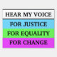 An inspirational 'social justice' sign in these challenging times of change: "Hear my voice for JUSTICE, for EQUALITY, for CHANGE!". You have the option of changing the words on the front and the back to suit your social movement or cause. A simple and bold design in vibrant colors to get your message out there.