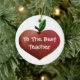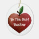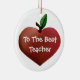 Sweet round ceramic ornament with graphic artwork of a heart shaped apple, on both sides. White whimsical text reads, To the Best Teacher, on the front, and personalized, with teachers name and additional text, on the back. Personalize the text to read anything you want. Great Christmas tree ornament any teacher will enjoy.