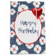 White flowers with red centers on blue jean fabric and red heart balloon for birthday.