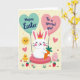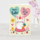 This card shows a soft pastel scene with a white rabbit 🐰 wearing a small crown and sitting on a light pink platform, eyes gently closed with rosy cheeks and a small smile as it holds an orange carrot close. Two heart-shaped balloons float on either side, creating a balanced look that frames the rabbit like a sweet little portrait. The left balloon is teal with a short Easter greeting in white letters centered on it, while the right balloon is pink with a brief affectionate message in white, placed the same way. The background is pale yellow with mint green accents, and tiny hearts plus scattered golden specks drift around like confetti, adding a flirty, friendly sparkle 🌷. In the upper left, a smiling sun leans in as if watching over the scene, and nearby a small yellow chick stands close, giving the layout a cozy, companionable feel. Along the lower area, a patterned pink egg sits among green ground shapes, with red strawberries dotted around like little surprises. The teal and pink balloons sit at shoulder height to the rabbit, their thin strings curving downward toward the center. A few small red strawberries and tiny heart shapes are sprinkled across the foreground beneath the rabbit’s seat.
