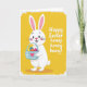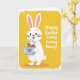 This card features an anthropomorphic white rabbit centered on a sunny yellow background, smiling with wide eyes and rosy cheeks that suggest a friendly, affectionate mood 🐰. Its long ears stand upright with soft pink inside, adding a gentle, bashful touch to the character’s expression. The rabbit holds a light blue basket close to its body, as if offering it to someone just out of frame like a small gesture of friendship. A tiny pink heart decorates the basket, and the eggs inside show mixed patterns in bright blue, orange, yellow, and deep pink tones. The background stays mostly open, with a lightly brushed texture that keeps the scene warm and bright without adding extra objects. On the right side, rounded white text sits in the open space, arranged in a neat stack so it balances the rabbit on the left 🌷. The yellow field is uninterrupted behind the greeting, making the white letters stand out clearly against the solid color.