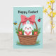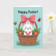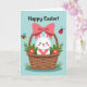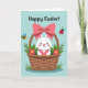 This card features a white, long-eared bunny peeking out of a tan wicker basket, looking straight at you with rosy cheeks and a tiny heart-shaped nose 🐰. A large pink bow sits on the basket like a gift, adding a sweet, affectionate touch, as if someone dressed it up for a dear friend. Around the basket, soft green leaves curl outward and bright red flowers with yellow centers cluster close, like they’re leaning in to keep the bunny company 🌷. The background is a light, clear blue that reads like open spring sky and keeps the scene airy and calm. Near the top edge, a small striped flying insect and a round red spotted beetle hover, giving the moment a gentle, shared-outdoors feeling. The words “Happy Easter!” curve across the top in dark lettering, standing out clearly against the blue. The basket weave is shown with simple line detail, and the bow’s loops and tails are shaded in pink to look plush and layered. The bunny’s ears rise above the rim of the basket, with pale pink inside and a small highlight on each eye.