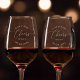 Custom-designed wedding wine glass set for the bride and groom featuring "Cheers to Love" modern calligraphy design with personalized name and date.