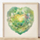 Rendered in soothing aqua, emerald, and golden hues, this painting is shaped into the iconic heart form. Vibrant leaves and delicate petals surround a radiant golden core, representing the illuminating energy of the heart chakra. Each element is awash in soft textures, the watercolor medium lending an ethereal, tranquil quality.