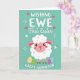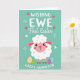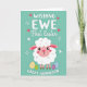 This design shows a plump, fluffy white lamb centered on a soft light teal background, with a gentle, friendly look that feels like a warm hug between close family or friends 🌷. Its face is light pink with tiny heart-shaped blush marks on the cheeks, round black eyes, and pink inner ears, standing on slim pink legs with small brown hooves. The wool is drawn in rounded, cloud-like curves that give it a cozy texture. Near the top, large white lettering reads “WISHING EWE” with small red hearts and white star shapes sprinkled around it 🐰. Just below that, smaller white text continues with “First Easter,” keeping the message stacked above the lamb’s head. Along the bottom, four pastel eggs sit in a neat row—yellow, green, blue, and lavender—each decorated with simple wavy lines. Beneath the eggs, “GREAT GRANDSON” appears in white, centered near the lower edge of the card. The hearts by the headline and the rosy cheek marks stand out clearly against the teal background.