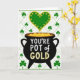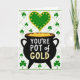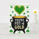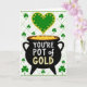 This St. Patrick's Day card centers on a black cauldron brimming with bright golden coins, like a little treasure shared between close friends. Across the front of the pot, the text “YOU’RE POT of GOLD” sits in dotted white letters, with “GOLD” outlined in yellow to match the coins. Floating above it is a rich green heart edged in a golden border, and inside the heart, tiny gold four-leaf clovers hint at a rare kind of affection 💚. The white background has a faint pale-green diagonal grid that softens the scene and keeps it airy. Scattered around are many small three-leaf shamrocks, giving the feeling of a lucky day unfolding all around you ☘️. Along the top and bottom edges, repeating shamrock borders frame the artwork like a neat ribbon. The coins glow in warm yellow against the dark pot while the heart’s gold outline stands out sharply over the light patterned backdrop.